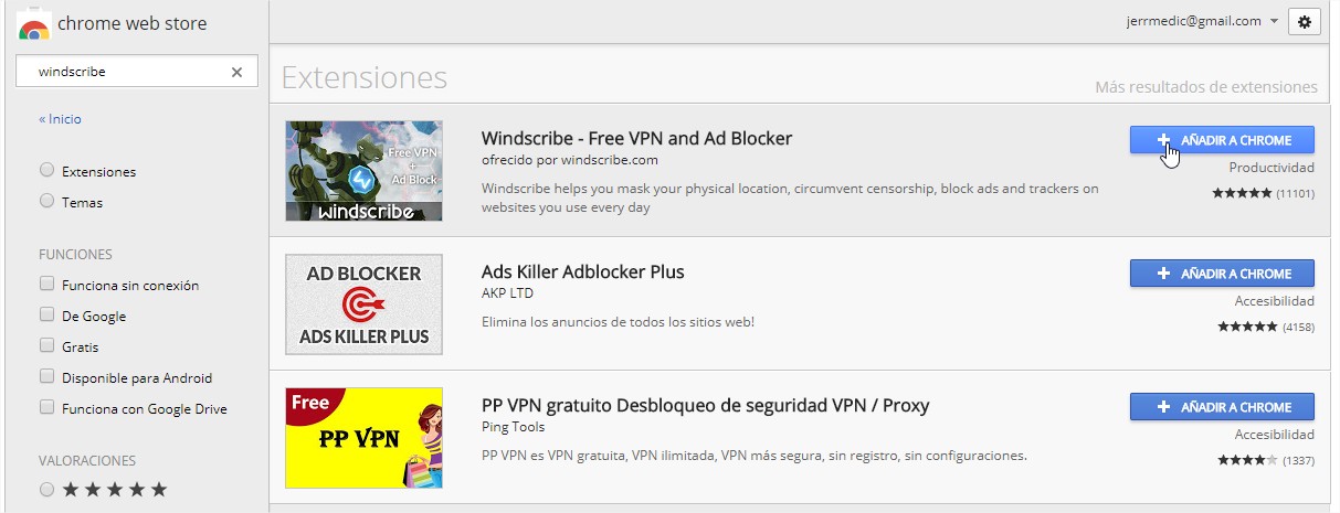 3. Una vez instalado el Google Chrome, tendran que entrar Chrome Web Store https://chrome.google.com/webstore/search/windscribe Click en «Añadir a Chrome» -> Añadir extensión