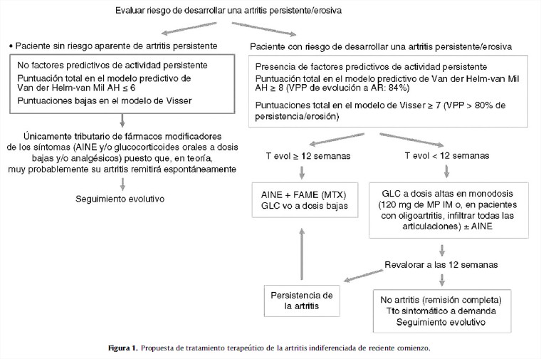 Según la EULAR,es recomendable administrar tratamiento con FAME tan pronto como sea posible en aquellos pacientes en los que hay riesgo de desarrollo de artritis persistente y/o erosiva, incluso si aún no satisfacen los criterios de clasificación establecidos para las enfermedades reumatológicas inflamatorias.