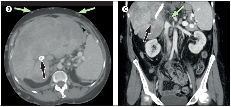 (C) Tomografía computarizada coronal que muestra la vena hepática ocluida (flecha negra) y la vena cava inferior (flecha verde pálida).
