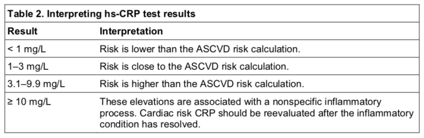 Para pacientes con riesgo de ASCVD de 7.5–14.9% a los 10 años, considere realizar pruebas con hs-CRP para ayudar a confirmar un riesgo elevado al decidir si recomendar el tratamiento con estatinas