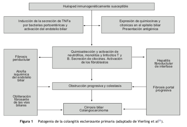 Enfermedad colestásica crónica, caracterizada por inflamación y fibrosis de las vías biliares intrahepáticas y extrahepáticas. Obliteración irregular de los conductos y progresa a cirrosis biliar. Se asocia a enfermedad inflamatoria intestinal, especialmente colitis ulcerosa.