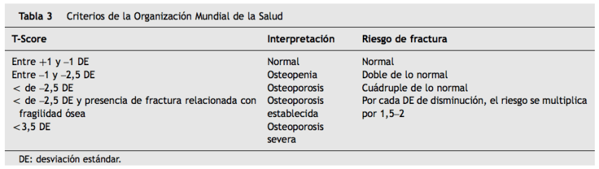• T-Score: número de desviaciones estándar con respecto al valor medio de la población de 20 a 39 años del mismo sexo. Por lógica, a medida que la edad del paciente va avanzado, la densidad mineral ósea va disminuyendo y la T-Score se va modificando.