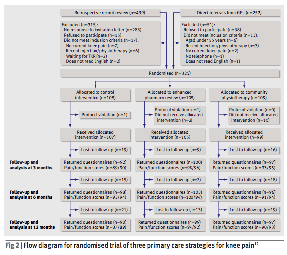 Muestran el flujo de participantes a través de las etapas del ensayo de una manera que debería ser fácil de seguir. La Figura 1 muestra un ejemplo exitoso de un gráfico de flujo que muestra una imagen clara del diseño y la conducta del ensayo. Incluye el número de personas examinadas y las razones de la exclusión, información que muchos ensayos no recopilan e informan. Los números que no reciben tratamiento aleatorio y los números perdidos durante el seguimiento son limitaciones clave que todo estudio debe documentar.