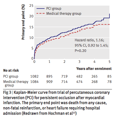 La Figura 3 muestra las características esenciales de un gráfica de Kaplan Meier. Los grupos de tratamiento son visualmente diferenciables, con una escala vertical adecuada y ejes claramente marcados. Debajo del eje horizontal, se muestran los números de participantes que permanecen en riesgo (es decir, aquellos que permanecen bajo observación y para quienes aún no se ha producido el evento). Se necesita una comparación estadística formal (en este caso, una relación de riesgo con un intervalo de confianza del 95% y el valor P de la prueba de rango logarítmico) para evaluar si la distancia entre las curvas es suficiente para representar una diferencia real en el riesgo entre el tratamiento y los brazos de control. Esta información a menudo se incluye mejor en la figura en sí. En este caso la ligera diferencia no es significativa.