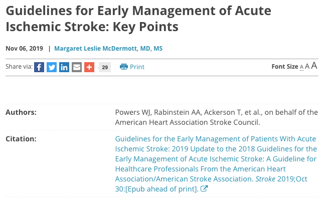 Los siguientes son puntos clave para recordar de la Actualización de 2019 de las Directrices de la American Heart Association / American Stroke Association (AHA / ASA) 2018 para el manejo temprano del accidente cerebrovascular isquémico agudo: