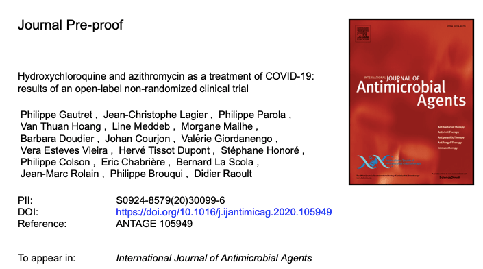 Los pacientes confirmados por el francés COVID-19 se incluyeron en un protocolo de brazo único desde principios de marzo hasta el 16 de marzo , para recibir 600 mg de hidroxicloroquina diariamente y su carga viral en hisopos nasofaríngeos se analizó diariamente en un hospital. Dependiendo de su presentación clínica, se agregó azitromicina al tratamiento. Los pacientes no tratados de otro centro y los casos que rechazaron el protocolo se incluyeron como controles negativos. La presencia y ausencia de virus en el día 6 posterior a la inclusión se consideró el punto final.