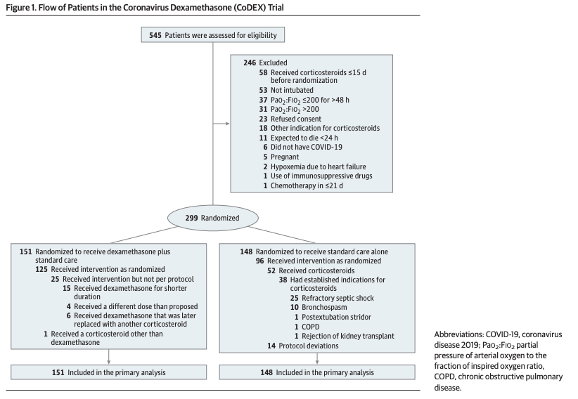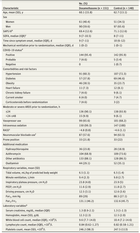 Intervenciones Veinte mg de dexametasona por vía intravenosa al día durante 5 días, 10 mg de dexametasona al día durante 5 días o hasta el alta de la UCI, más atención estándar (n = 151) o atención estándar sola (n = 148).