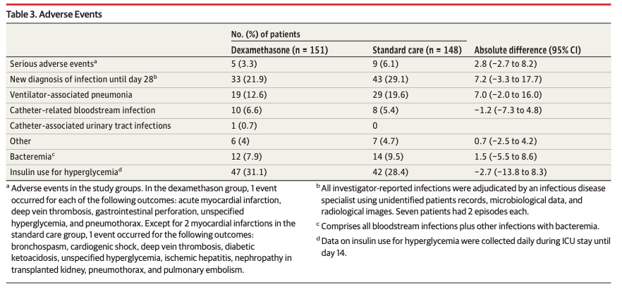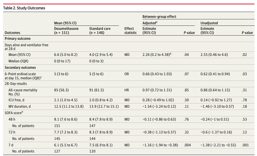 Resultados Se inscribió un total de 299 pacientes (edad media [DE], 61 [14] años; 37% mujeres) y todos completaron el seguimiento. Los pacientes aleatorizados al grupo de dexametasona tuvieron una media de 6,6 días sin ventilador (IC del 95%, 5,0 a 8,2) durante los primeros 28 días frente a 4,0 días sin ventilador (IC del 95%, 2,9 a 5,4) en el grupo de atención estándar (diferencia , 2,26; IC del 95%, 0,2-4,38; P = 0,04). A los 7 días, los pacientes del grupo de dexametasona tenían una puntuación SOFA media de 6,1 (IC del 95%, 5,5-6,7) frente a 7,5 (IC del 95%, 6,9-8,1) en el grupo de atención estándar (diferencia, -1,16; IC del 95% , −1,94 a −0,38; P= .004). No hubo diferencias significativas en los resultados secundarios preespecificados de mortalidad por todas las causas a los 28 días, días sin UCI durante los primeros 28 días, duración de la ventilación mecánica a los 28 días o escala ordinal de 6 puntos a los 15 días. Treinta y tres pacientes (21,9%) en el grupo de dexametasona frente a 43 (29,1%) en el grupo de atención estándar experimentaron infecciones secundarias, 47 (31,1%) frente a 42 (28,3%) necesitaron insulina para el control de la glucosa y 5 (3,3%) vs 9 (6,1%) experimentaron otros eventos adversos graves.