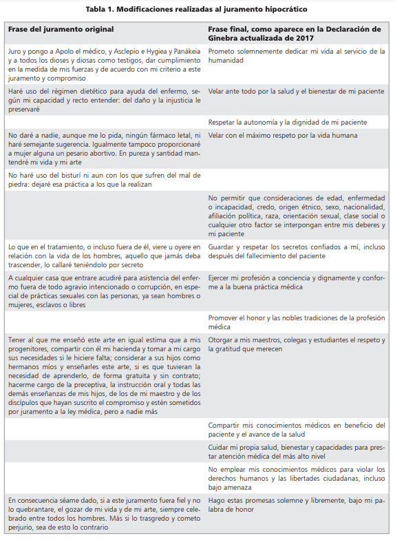 La primera actualización importante, conocida como “Declaración de Ginebra”, se dio durante la segunda asamblea de la AMM en 1948, como reacción ante los crímenes médicos cometidos durante la segunda guerra mundial. Posteriormente, la Declaración de Ginebra fue enmendada en las Asambleas de la AMM en 1968, 1983 y 1994; y fue revisada editorialmente por el Consejo de la AMM en 2005 y en 2006. Finalmente, un grupo de trabajo ad hoc realizó modificaciones que fueron aprobadas por la Asamblea de la AMM en 2017, siendo ésta la versión actual del juramento hipocrático3 , cuya versión en español está disponible en la página de la AMM: https://www.wma. net/es/policies-post/declaracion-de-ginebra. La comparación entre el juramento original, la Declaración de Ginebra de 1948 y la versión actual se muestra en la Tabla 1.