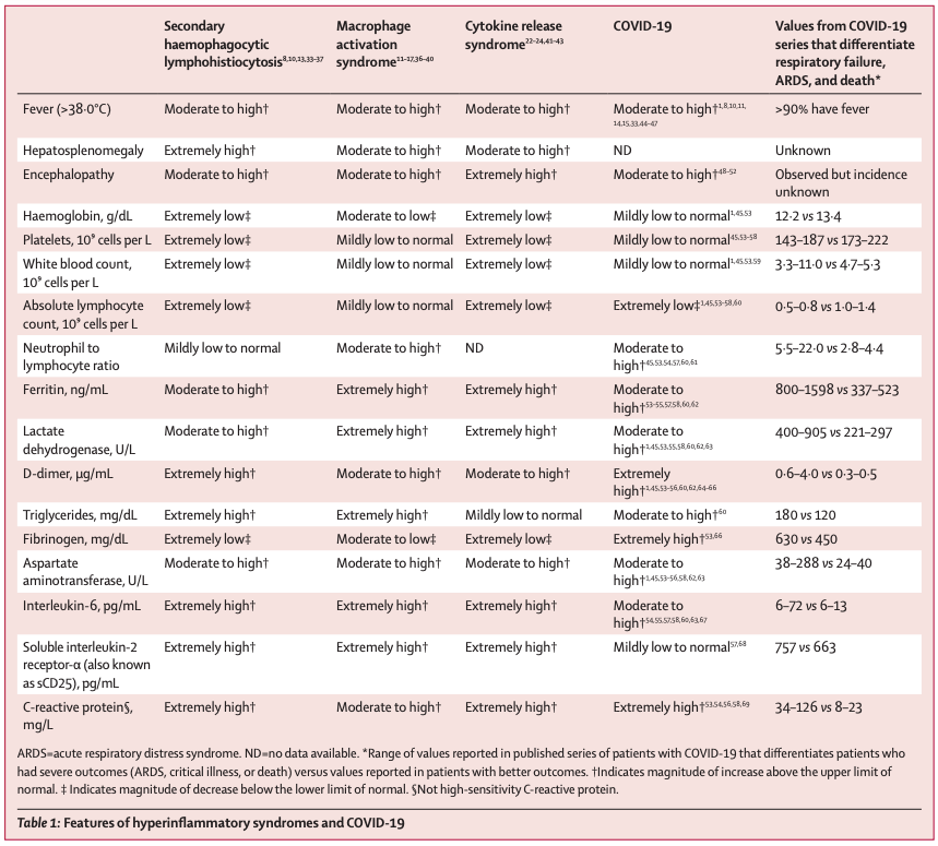 Comparamos las características de las condiciones hiperinflamatorias bien descritas con las descritas en el síndrome hiperinflamatorio único de COVID-19 en la tabla 1 y en el apéndice (págs. 1-3) . El cHIS parece compartir una característica fisiopatológica fundamental de la activación de macrófagos prominentes con otros síndromes hiperinflamatorios; sin embargo, otras características observadas en COVID-19 son distintas de los síndromes clásicos de tormenta de citocinas, incluida la escasez de citopenias y concentraciones cuantitativas más bajas de citocinas inflamatorias circulantes que en otras enfermedades comparables.