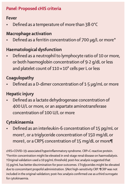 Propusimos y validamos criterios para hiperinflamación en COVID-19. Este estado hiperinflamatorio, cHIS, se asocia comúnmente con progresión a ventilación mecánica y muerte. Se necesita validación externa. La escala cHIS podría ser útil para definir las poblaciones objetivo de ensayos y terapias inmunomoduladoras.
