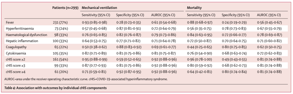 Los resultados de un análisis de sensibilidad post-hoc para evaluar la frecuencia y la asociación de los criterios individuales de cHIS con los resultados clínicos se muestran en la tabla 4 . En un umbral de 2 o más, la escala tenía una excelente sensibilidad tanto para la ventilación mecánica como para la mortalidad. La coagulopatía, la hiperferritinemia, la disfunción hematológica y la citociniemia se asociaron más específicamente con la ventilación mecánica, mientras que la coagulopatía se asoció más con la mortalidad.