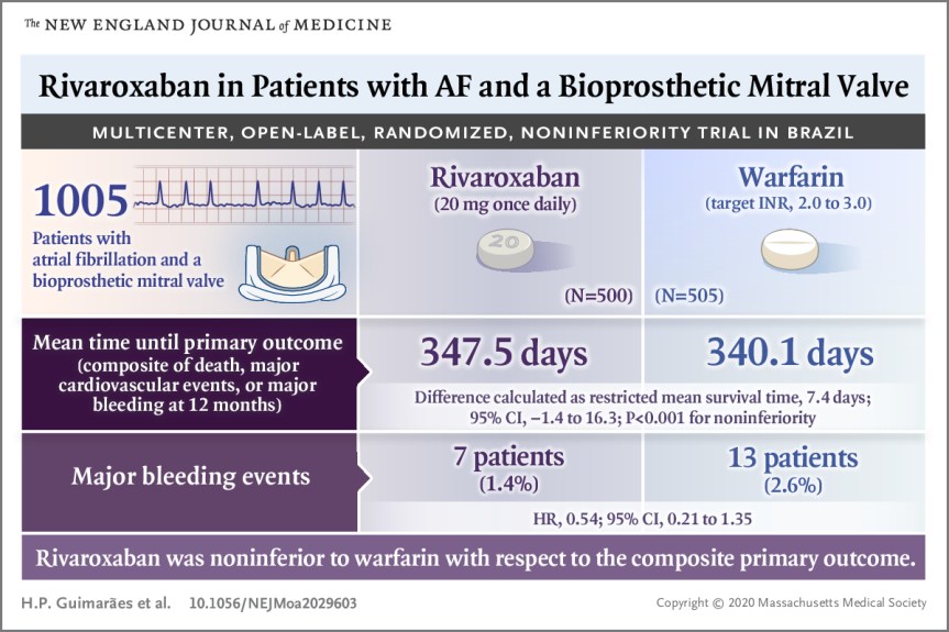 Se inscribió un total de 1005 pacientes en 49 sitios en Brasil. Un evento de resultado primario ocurrió en una media de 347,5 días en el grupo de rivaroxabán y 340,1 días en el grupo de warfarina (diferencia calculada como tiempo de supervivencia medio restringido, 7,4 días; intervalo de confianza [IC] del 95%, −1,4 a 16,3; P < 0,001 para no inferioridad). La muerte por causas cardiovasculares o eventos tromboembólicos ocurrió en 17 pacientes (3,4%) en el grupo de rivaroxaban y en 26 (5,1%) en el grupo de warfarina (cociente de riesgo, 0,65; IC del 95%, 0,35 a 1,20). La incidencia de accidente cerebrovascular fue del 0,6% en el grupo de rivaroxabán y del 2,4% en el grupo de warfarina (índice de riesgo, 0,25; IC del 95%, 0,07 a 0,88). Se produjo una hemorragia mayor en 7 pacientes (1,4%) en el grupo de rivaroxaban y en 13 (2,6%) en el grupo de warfarina (cociente de riesgo, 0,54; IC del 95%, 0,21 a 1,35).