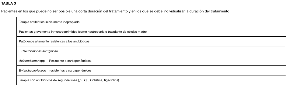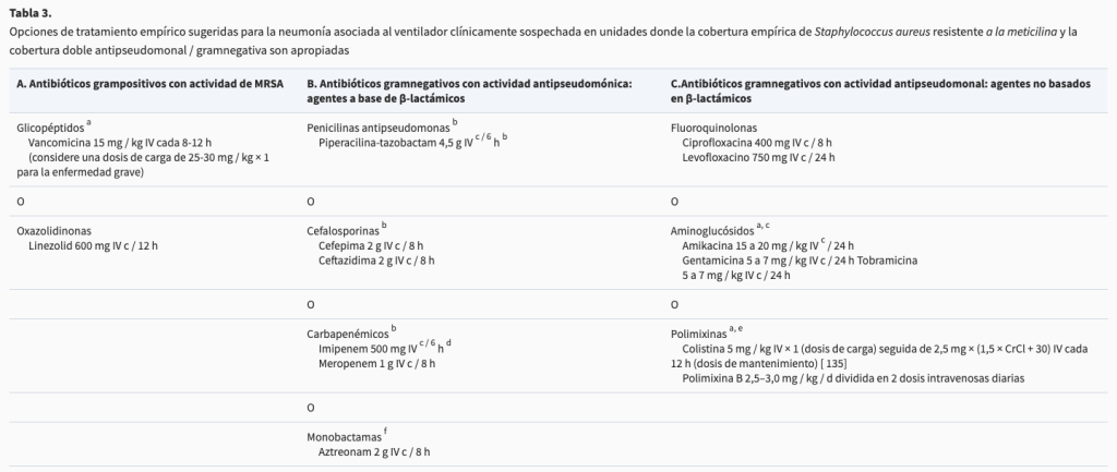 - 4. Sugerimos prescribir 2 antibióticos antipseudomonas de diferentes clases para el tratamiento empírico de sospecha de NAV solo en pacientes con alguno de los siguientes: un factor de riesgo de resistencia a los antimicrobianos (Tabla 2 ), pacientes en unidades donde> 10% de cepas gramnegativas son resistentes a que se considere un agente para la monoterapia y pacientes en una UCI donde no se dispone de tasas de susceptibilidad antimicrobiana local (recomendación débil, evidencia de baja calidad) .
