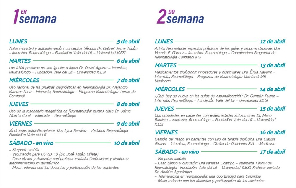 Nuestra intención es la de educar, compartiendo el conocimiento actual de la reumatología en Colombia y en el mundo. Para esta ocasión, incluiremos a la academia, tanto estudiantes como profesores de los programas de especializaciones clínicas de la ciudad.