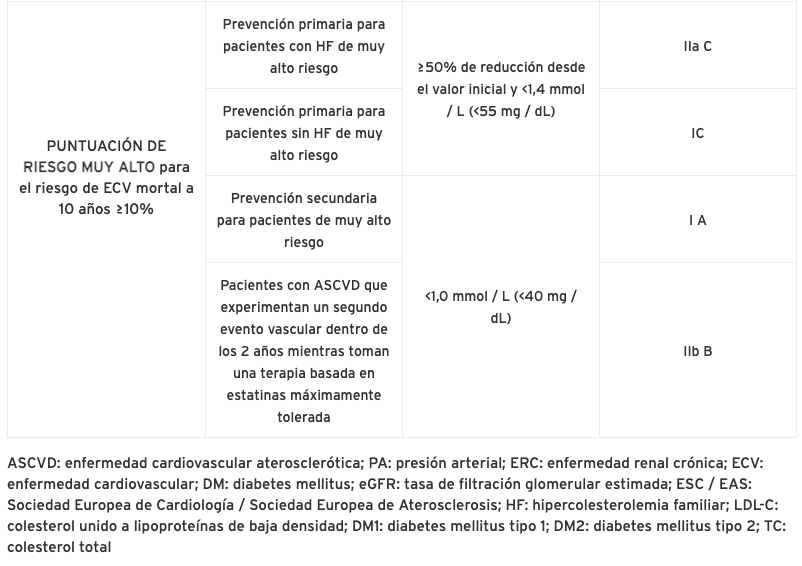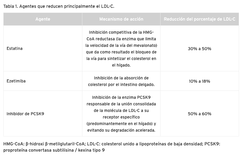 El tratamiento óptimo debe adaptarse al riesgo cardiovascular del paciente. Objetivos de tratamiento de LDL-C nuevos y más restrictivos en pacientes con alto riesgo (reducción ≥50% desde el inicio y <1,8 mmol / L [<70 mg / dL]) y riesgo muy alto (reducción ≥50% desde el inicio y <1,4 mmol / L [<55 mg / dL]) para eventos de ASCVD motivó la necesidad de enfatizar un tratamiento combinado con una dosis de estatina máxima tolerada, primero con ezetimiba y luego con un inhibidor de PCSK9 para lograr estos objetivos (Tabla 2). Los pacientes que han experimentado un SCA son un grupo de muy alto riesgo de interés particular, donde un inhibidor de PCSK9 debe introducirse temprano después del evento (si es posible, durante la hospitalización), o alternativamente cuando no se alcanza el objetivo de LDL-C después de 4 a 6 semanas a pesar de la máxima tolerancia al tratamiento con estatinas y ezetimiba.