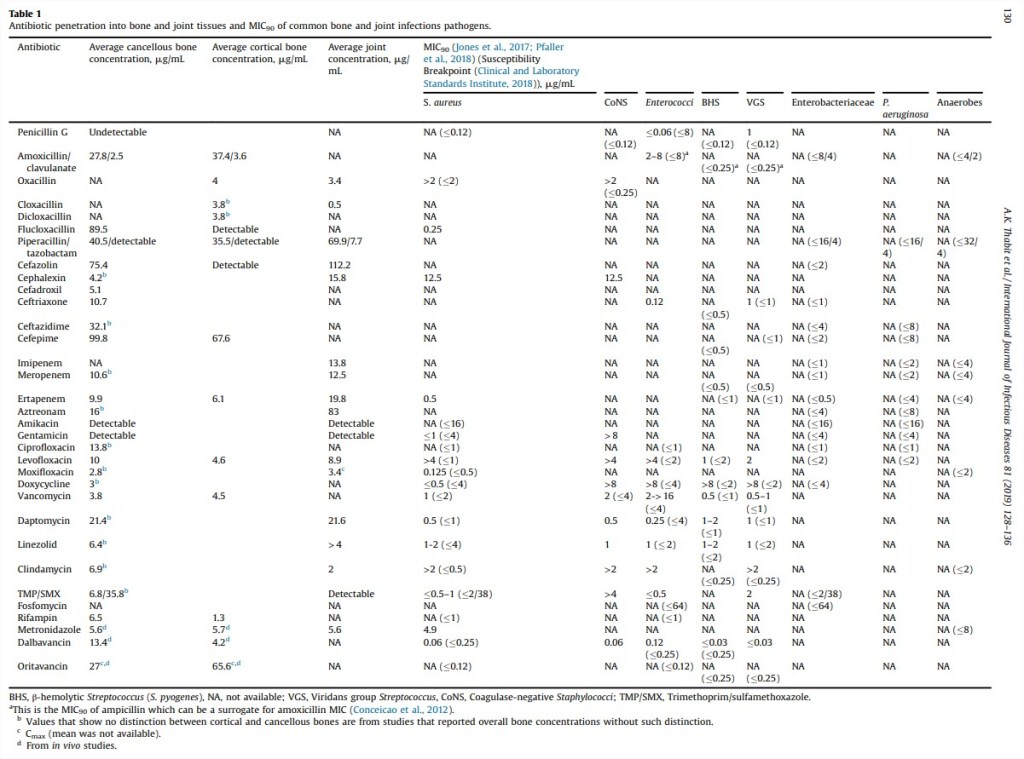 En general, la mayoría de los antibióticos analizados en esta revisión tienen la capacidad de penetrar en los tejidos óseos rígidos, así como en el líquido sinovial . Los antibióticos que mostraron buenos perfiles de penetración en los tejidos óseos incluyen amoxicilina , piperacilina / tazobactam , flucloxacilina , cloxacilina , cefalosporinas (todos los cuatro generaciones), carbapenems(no hay datos para imipenem), aztreonam , aminoglicósidos , las fluoroquinolonas , doxiciclina , vancomicina , linezolid , daptomicina , clindamicina, trimetoprim / sulfametoxazol , fosfomicina , rifampicina , dalbavancina y oritavancina . Pocas excepciones incluyen la penicilina y el metronidazol, que mostraron una penetración en los huesos inferior a la óptima. El buen perfil observado con los huesos fue similar con la penetración del tejido articular, excepto para la flucloxacilina y el metronidazol. Además, faltaban datos sobre la penetración del espacio articular para penicilina, cloxacilina, cefalosporinas de segunda, tercera y cuarta generación, ciprofloxacina , moxifloxacina, doxiciclina, fosfomicina, rifampicina y oritavancina. En particular, el grado y la velocidad de penetración varían entre los diferentes agentes, probablemente debido a variaciones en las características farmacocinéticas . Afortunadamente, a pesar de la variación en el grado de penetración, todos los agentes con buenos perfiles de penetración reportados alcanzan concentraciones que son suficientes para la actividad antibacteriana, como lo demuestra la comparación con el MIC 90o los puntos de corte de MIC de varios organismos implicados en infecciones óseas y articulares.. Curiosamente, los resultados de un estudio reciente de Li et al que mostró la no inferioridad de los antibióticos orales frente a los antibióticos intravenosos para las infecciones óseas y articulares fueron consistentes con los hallazgos farmacocinéticos de los antibióticos informados en esta revisión ( Li et al., 2019 ).