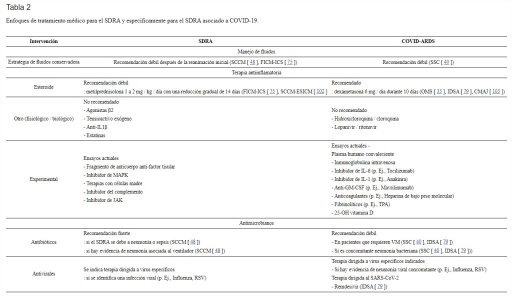 Existe una investigación activa sobre varias terapias antivirales y antiinflamatorias específicamente para la infección por SARS-CoV-2 que resulta en neumonía por COVID-19 y / o ARDS (Tabla 2). Hay pruebas contundentes que respaldan que los corticosteroides (es decir, dexametasona) reducen la necesidad de ingreso en la UCI e intubación / VM en pacientes con COVID-19 hipoxémicos hospitalizados. Además, en pacientes con COVID-ARDS, los corticosteroides acortan la duración de la VM y reducen la mortalidad. Como tal, los corticosteroides se recomiendan encarecidamente para los pacientes hipoxémicos con COVID-19. Remdesivir es el primer fármaco antiviral que tiene algún beneficio clínico, concretamente en la reducción del tiempo de recuperación. Muchas terapias putativas se encuentran en ensayos clínicos en curso con alguna promesa de prevenir o tratar COVID-19, incluido el plasma humano convaleciente, la anticoagulación sistémica y la 25-hidroxi vitamina D. Se han considerado otras terapias médicas, pero no han mostrado ningún beneficio, como lopanivir / ritonavir e hidroxicloroquina. Existe preocupación en torno al uso clínico rutinario de terapias experimentales no probadas, incluido el alto riesgo de interacciones fármaco-fármaco dado que la mayoría de los pacientes hospitalizados con COVID-19 son mayores con múltiples comorbilidades que requieren tratamiento con muchos otros medicamentos.