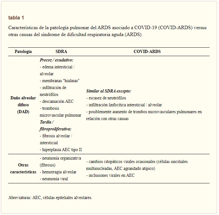 La patología del ARDS asociado a COVID-19 (COVID-ARDS) también se caracteriza en gran medida por DAD, con algunas diferencias clave como el predominio de linfocitos en lugar de neutrófilos (tabla 1). Algunos estudios han destacado una lesión CE microvascular pulmonar más grave asociada con una trombosis microvascular extensa, por ejemplo, la carga de coágulos vasculares pulmonares fue hasta nueve veces mayor en el SDRA-COVID que en el SDRA asociado a la influenza. Sin embargo, tales hallazgos microvasculares pulmonares no se han observado de manera consistente en otras descripciones patológicas. La fisiopatología de la insuficiencia respiratoria en la mayoría de los pacientes con COVID-SDRA también es similar a otras causas de SDRA, como atelectasia, baja distensibilidad respiratoria y derivación intrapulmonar. Se ha sugerido que algunos pacientes con COVID-ARDS manifiestan un fenotipo diferente caracterizado por consolidación sin atelectasia, distensibilidad respiratoria preservada y una desregulación de la perfusión más llamativa, que puede tener implicaciones en el tratamiento. Esta sigue siendo un área de controversia y de investigación clínica y fisiológica activa.