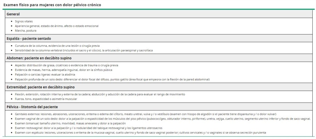 ●Síndrome de dolor pélvico miofascial: las mujeres con síndrome de dolor pélvico miofascial generalmente se presentan con dolor en la pelvis, la vagina, la vulva, el recto o la vejiga, o en áreas de referencia más distantes como los muslos, las nalgas, las caderas o la parte inferior del abdomen. Estas mujeres también pueden tener pesadez, síntomas de urgencia o frecuencia de la vejiga y tenesmo. Los hallazgos de la exploración física de los músculos pélvicos sensibles y los puntos gatillo son muy sugestivos de síndrome de dolor pélvico miofascial. Los puntos gatillo son nódulos palpables hiperirritables que son dolorosos a la compresión. Por lo general, estas mujeres se benefician del tratamiento de fisioterapeutas especializados y posiblemente del tratamiento multidisciplinario de especialistas en fisiatría. El dolor miofascial a menudo es comórbido con otros síndromes de dolor observados en la DPC.