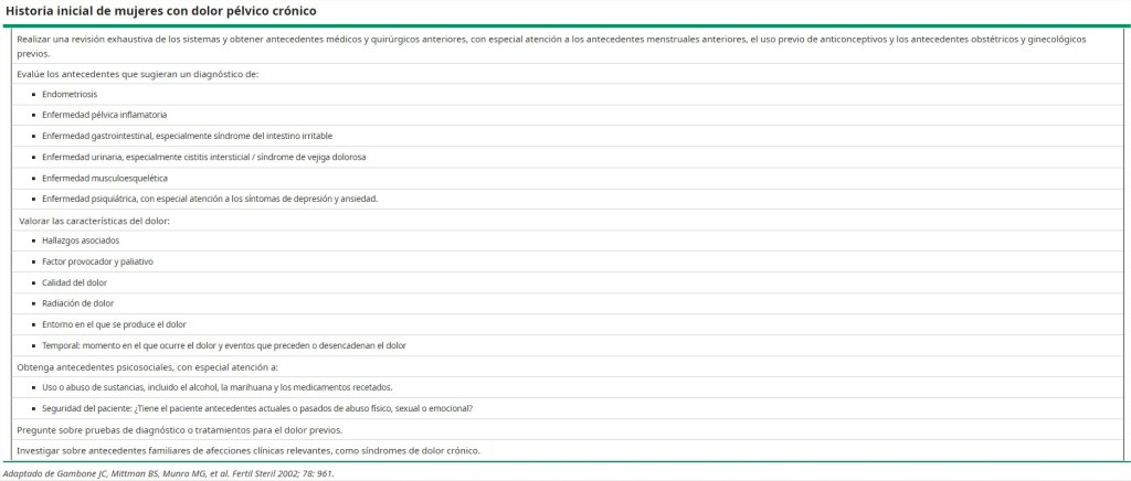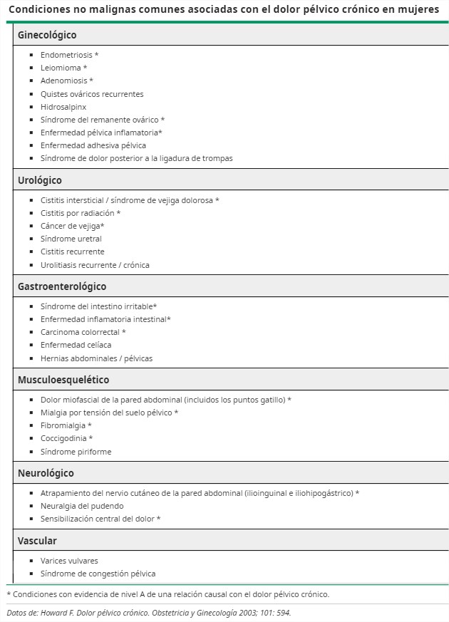 El dolor pélvico crónico (DPC) es un síntoma que puede representar una patología en un sistema de órganos específico, un síndrome de dolor crónico o ambos. Como las mujeres con DPC pueden tener más de una etiología de su dolor, los objetivos de la evaluación incluyen identificar las causas tratables del dolor y diferenciar las causas periféricas específicas de las que se superponen con los síndromes de dolor centralizado, ya que los tratamientos pueden diferir sustancialmente.