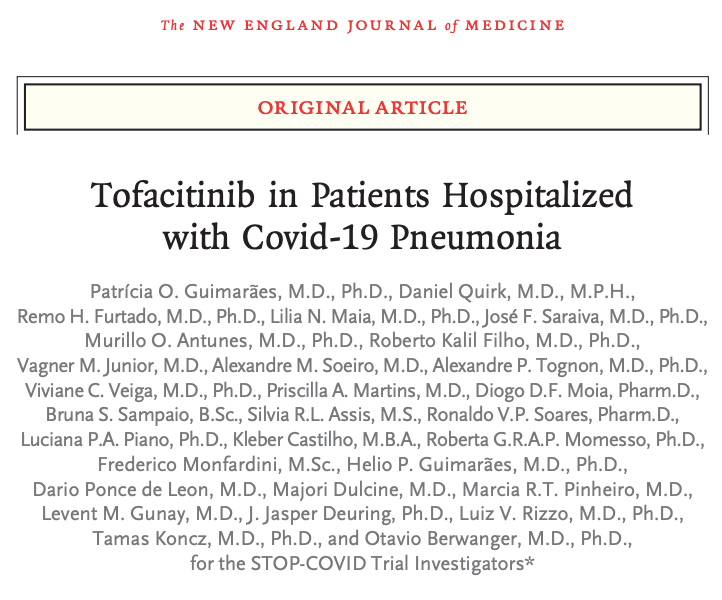Entre los pacientes hospitalizados con neumonía por Covid-19, tofacitinib condujo a un menor riesgo de muerte o insuficiencia respiratoria hasta el día 28 que el placebo. (Financiado por Pfizer; número STOP-COVID ClinicalTrials.gov, NCT04469114. se abre en una nueva pestaña.)