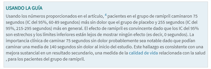 Este artículo describe un ensayo que incluye a 212 pacientes con enfermedad arterial periférica y antecedentes de claudicación intermitente estable . Los participantes fueron asignados al azar a ramipril, 10 mg al día o placebo durante 24 semanas. Los resultados primarios fueron el tiempo de caminata sin dolor y el tiempo máximo de caminata.