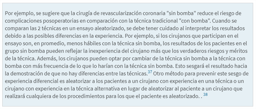 Por último, las diferencias en la atención al paciente distintas de la intervención en estudio ( cointervenciones) pueden, si afectan los resultados del estudio, sesgar los resultados. El cegamiento efectivo elimina la posibilidad de una administración diferencial consciente o inconsciente de intervenciones efectivas a los grupos de tratamiento y control. Cuando no es posible un cegamiento efectivo, la documentación de posibles cointervenciones se vuelve importante.