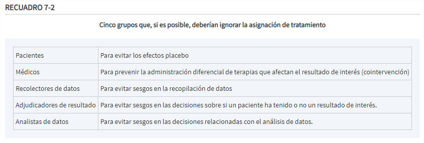 El recuadro 7-2 describe 5 grupos involucrados en ensayos clínicos que, idealmente, no se darán cuenta de si los pacientes están recibiendo la terapia experimental o la terapia de control. Los pacientes que toman un tratamiento que creen que es efectivo pueden sentirse y funcionar mejor que aquellos que no lo hacen, incluso si el tratamiento no tiene actividad biológica. Aunque la magnitud y la consistencia de este efecto placebo siguen siendo inciertas, entre y investigadores interesados en determinar el impacto biológico de un tratamiento se asegurarán de que los pacientes estén ciegos a la asignación del tratamiento. De manera similar, los diseños de investigación rigurosos asegurarán el cegamiento de los que cuidan a los participantes, así como de los que recopilan, evalúan y analizan los datos ( Recuadro 7-2). Las demostraciones de sesgo introducidas por el desenmascaramiento, como los resultados de un ensayo sobre la esclerosis múltiple en el que un beneficio del tratamiento juzgado por evaluadores de resultado no cegados desapareció cuando los adjudicadores del resultado estaban cegados, destacan la importancia del cegamiento. Cuanta más subjetividad esté involucrada en juzgar si un paciente ha tenido un resultado objetivo, más importante se vuelve el cegamiento. Por ejemplo, el cegamiento de un evaluador de resultados es innecesario cuando el resultado es la mortalidad por todas las causas.
