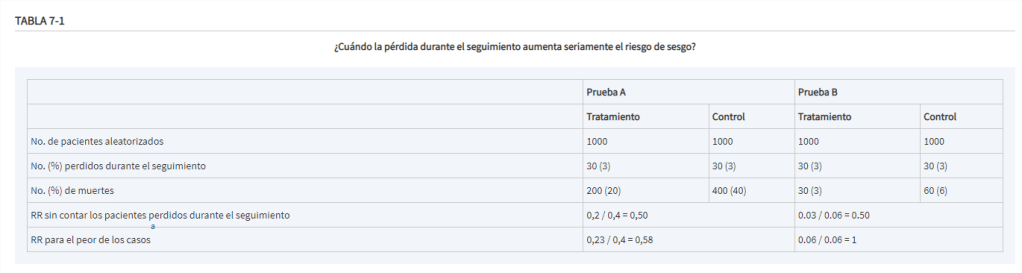 Por lo tanto, las pérdidas durante el seguimiento pueden aumentar sustancialmente el riesgo de sesgo. Si asumir el peor de los casos no cambia las inferencias que surgen de los resultados del estudio, es poco probable que la pérdida durante el seguimiento sea un problema. Si tal suposición alteraría significativamente los resultados, la medida en que se introduzca el sesgo dependerá de la probabilidad de que los pacientes del tratamiento perdidos durante el seguimiento obtengan malos resultados, mientras que los pacientes control perdidos durante el seguimiento obtuvieron buenos resultados. Esa decisión es cuestión de juicio.