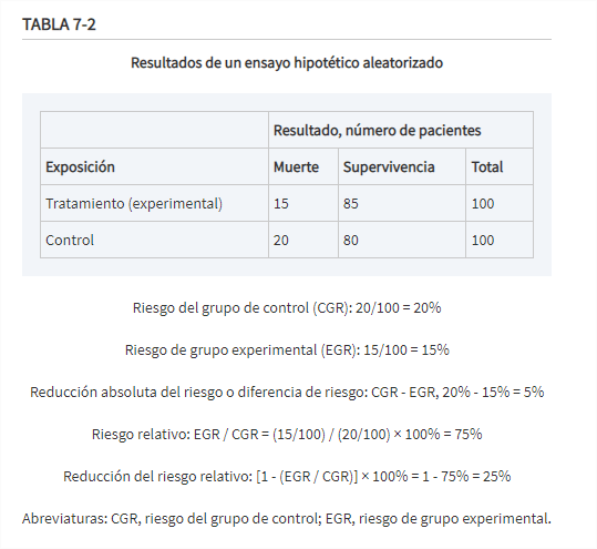 Una posibilidad es la diferencia absoluta (conocida como reducción absoluta del riesgo [ARR] o diferencia de riesgo ) entre la proporción que murió en el grupo de control ( riesgo del grupo control [CGR]) y la proporción que murió en el grupo experimental ( riesgo del grupo experimental [EGR]) o CGR – EGR = 0,20 – 0,15 = 0,05. Otra forma de expresar el impacto del tratamiento es como el RR: el riesgo de eventos entre los pacientes que reciben el nuevo tratamiento en relación con ese riesgo entre los pacientes del grupo de control, o EGR / CGR = 0,15 / 0,20 = 0,75.