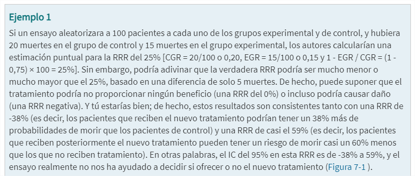 Por lo general, utilizamos el IC del 95% (consulte el Capítulo 10 , Intervalos de confianza: ¿el estudio único o el metanálisis fue lo suficientemente extenso?). Puede considerar que el IC del 95% define el rango que, asumiendo que el estudio tiene un bajo riesgo de sesgo, incluye la verdadera RRR el 95% del tiempo. La verdadera RRR generalmente estará más allá de estos extremos solo el 5% de las veces, una propiedad del IC que se relaciona estrechamente con el nivel convencional de significación estadística de p <0,05. Ilustramos el uso de CI en los siguientes ejemplos.