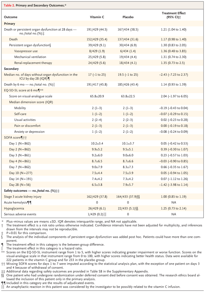 Un total de 872 pacientes fueron aleatorizados (435 al grupo de vitamina C y 437 al grupo de control). El resultado primario ocurrió en 191 de 429 pacientes (44,5 %) en el grupo de vitamina C y en 167 de 434 pacientes (38,5 %) en el grupo de control (riesgo relativo, 1,21; intervalo de confianza [IC] del 95 %, 1,04 a 1,40; p=0,01). A los 28 días, la muerte había ocurrido en 152 de 429 pacientes (35,4 %) en el grupo de vitamina C y en 137 de 434 pacientes (31,6 %) en el grupo de placebo (razón de riesgo, 1,17; IC del 95 %, 0,98 a 1,40) y disfunción orgánica persistente en 39 de 429 pacientes (9,1 %) y 30 de 434 pacientes (6,9 %), respectivamente (razón de riesgo, 1,30; IC del 95 %, 0,83 a 2,05). Los resultados fueron similares en los dos grupos con respecto a las puntuaciones de disfunción de órganos, biomarcadores, supervivencia a los 6 meses, calidad de vida relacionada con la salud, lesión renal aguda en etapa 3 y episodios de hipoglucemia.