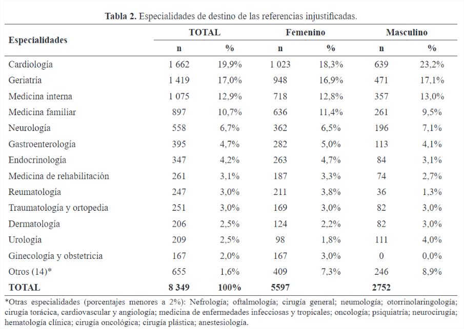 La frecuencia de referencias injustificadas fue de 8,4 %. El 34,2 % fue de pacientes adultos; el 65,8 %, de adultos mayores; y el 67 %, de pacientes mujeres Las especialidades con más referencias injustificadas fueron cardiología, geriatría, medicina interna, medicina familiar y neurología. Los diagnósticos injustificados más frecuentes fueron hipertensión esencial, lumbago no especificado y cefalea.