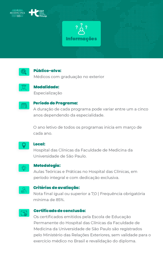 Está dirigido a médicos graduados fuera de Brasil (extranjeros y brasileños), con o sin experiencia en su área de especialización, que no tengan su título revalidado o en proceso de revalidación y que estén interesados en especializarse en el HCFMUSP para cursar los conocimientos adquiridos a su país de residencia.