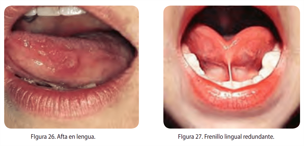 La lengua puede presentar algunas anomalías como: macroglosia (Fig. 21) en caso de hipotiroidismo congénito, acromegalia, síndrome de Down, microglosia (Fig. 22) en caso de deshidratación, lengua saburral en estados febriles, estomatitis, roja en la escarlatina, magenta en la defciencia de ribofavina, lengua negra o velluda (Fig. 23), por hipertrofa de las papilas, lengua de color obscuro cuando se ingieren alimentos que contienen pigmentos o medicamentos como sales de bismuto, lengua de perico, de color café oscuro, seca y pequeña en la deshidratación severa, lengua escrotal (Fig. 24) la cual presenta fsuras longitudinales profundas, lengua geográfca (Fig. 25) que presenta áreas lisas de color rojo vivo por ausencia de papilas fliformes, aftas (Fig. 26) y tumoraciones como el carcinoma y el angioma. En ocasiones la movilidad de la lengua se ve limitada cuando el frenillo lingual es demasiado corto o ancho y fja la cara ventral de la lengua a la encía inferior, provocando alteraciones en la masticación y la pronunciación de las palabras