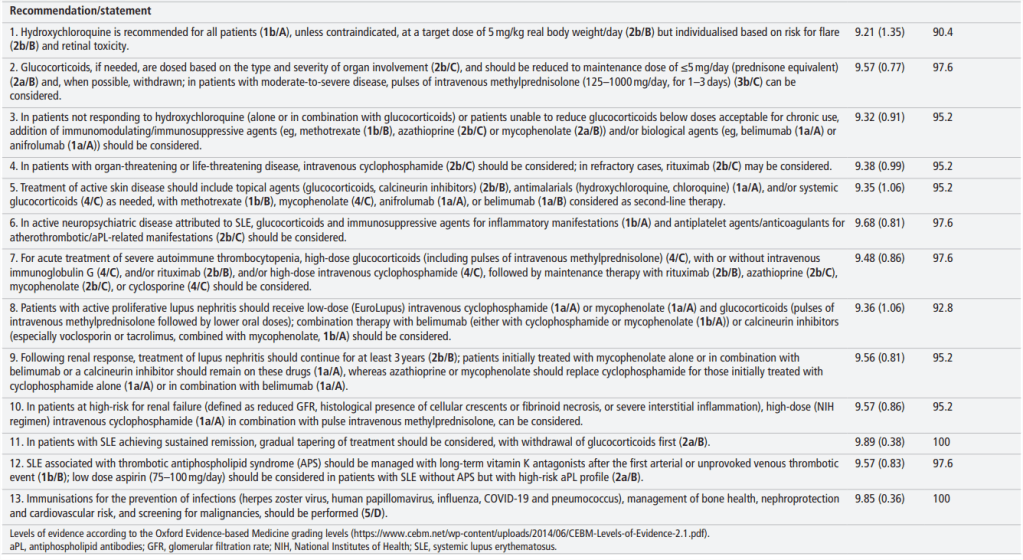 1. Se recomienda hidroxicloroquina para todos los pacientes, a menos que esté contraindicada, en una dosis objetivo de 5 mg/kg de peso corporal real/día, pero individualizada según el riesgo de exacerbación y Toxicidad retiniana.