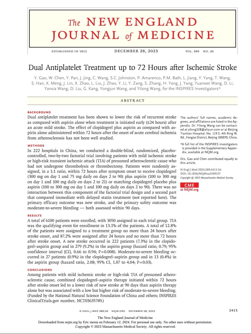 Yilong Wang, MD, PhD, que ocupó cargos en el Departamento de Neurología del Hospital Tiantan de Beijing y varias otras instituciones, fue el autor correspondiente de este estudio. Este estudio fue publicado en línea el 28 de diciembre en la revista New England Journal of Medicine.