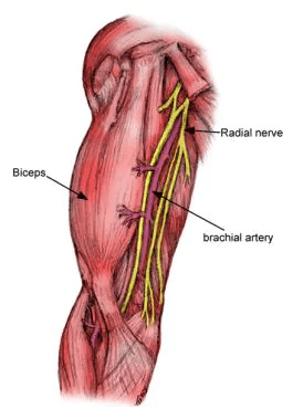 La arteria braquial se identifica mejor entre el epicóndilo medial del húmero y el tendón del bíceps braquial en la fosa antecubital. Se puede sentir más arriba en el brazo, en el surco entre los tendones del bíceps y del tríceps. La vena basílica y el nervio braquial se encuentran muy cerca (vea la imagen a continuación).