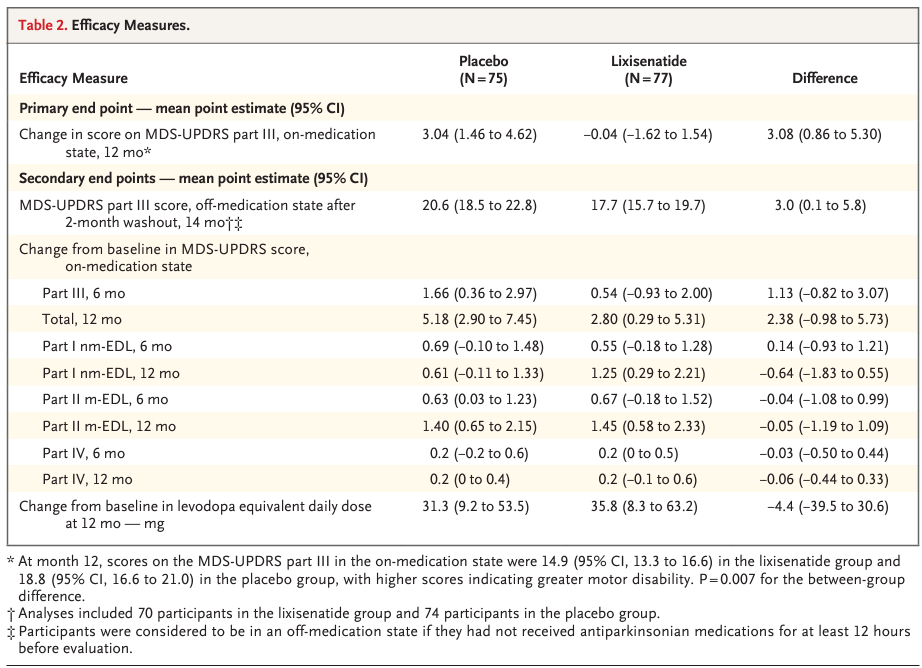 Se utilizó el cambio en las puntuaciones de la MDS-UPDRS parte III como el criterio de valoración principal, lo cual es relevante y específico para la población de estudio. La significancia estadística alcanzada (P = 0.007) sugiere un efecto beneficioso de la lixisenatida, pero es importante considerar el tamaño del efecto y su relevancia clínica.