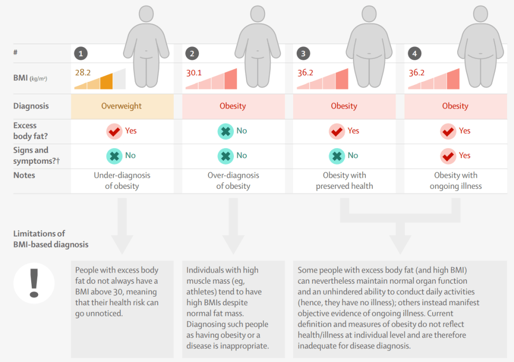 La siguiente imagen muestra las limitaciones del IMC (Índice de Masa Corporal) como único criterio para diagnosticar obesidad y problemas de salud. Se presentan cuatro casos con diferentes combinaciones de IMC, exceso de grasa corporal y signos de enfermedad: