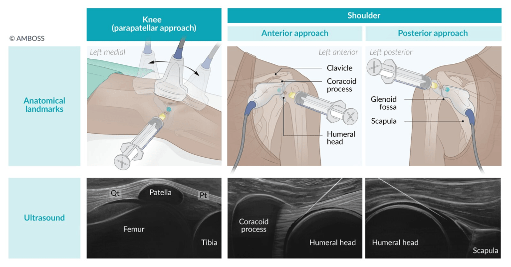 - Complemento útil para distinguir entre bursitis superficial y derrame intraarticular.