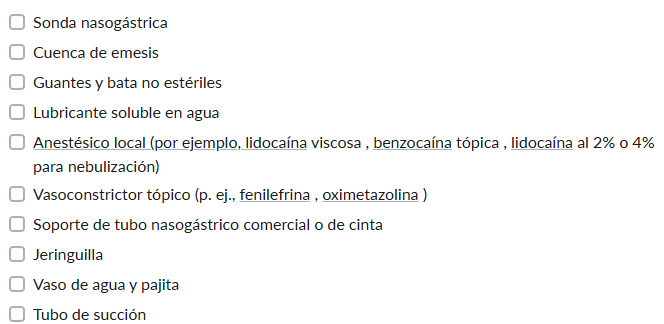 - Anestesiar las fosas nasales, la nasofaringe y la orofaringe con anestesia local (p. ej., lidocaína nebulizada , benzocaína , gel de lidocaína ).