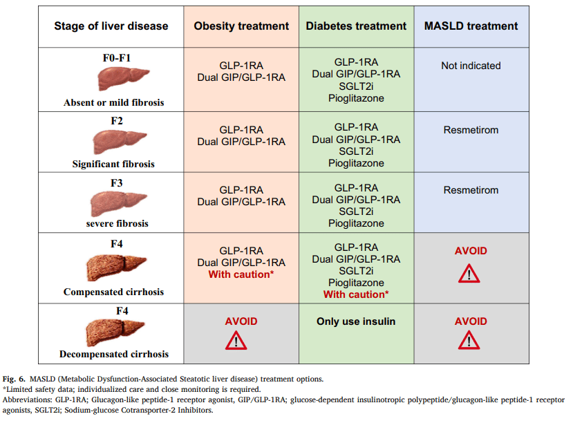 Fármacos como semaglutida y tirzepatida han demostrado mejorar significativamente la esteatosis y la inflamación hepática. Además, recientemente se ha aprobado resmetirom, un agonista del receptor β de hormona tiroidea, como tratamiento específico para MASH en etapas F2–F3.