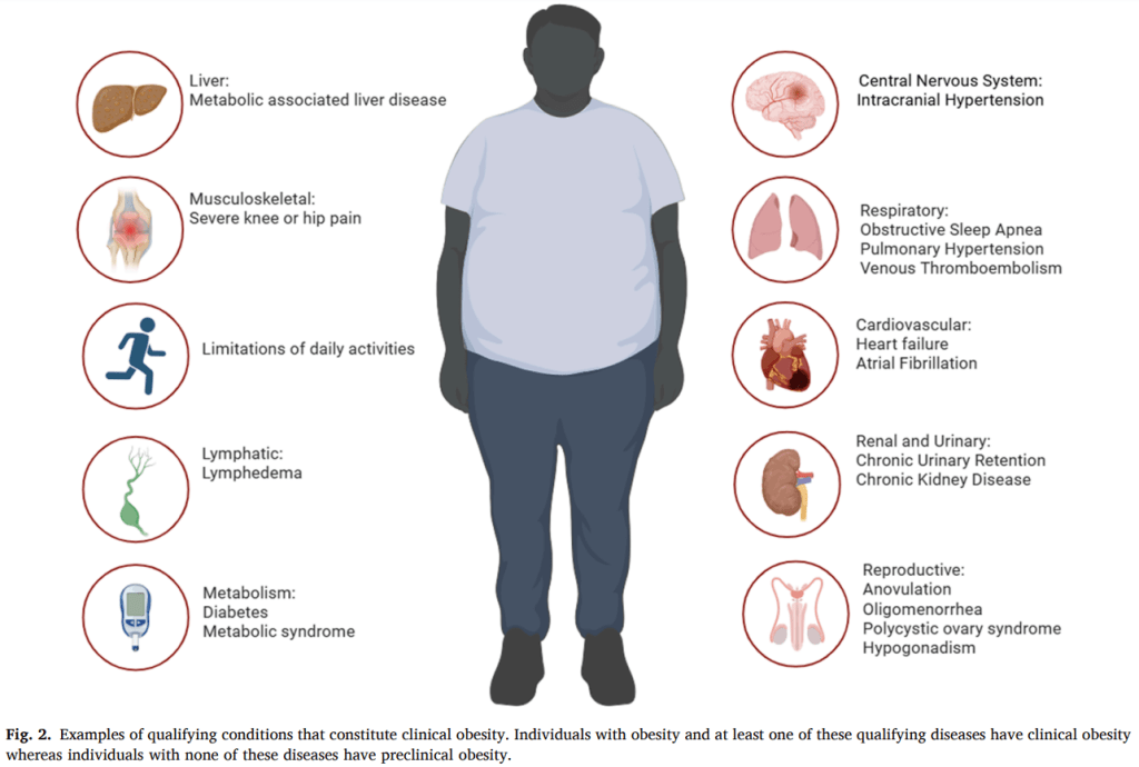 - Obesidad clínica: presencia de exceso de grasa acompañado de disfunción orgánica o limitación funcional atribuible a la adiposidad. Ejemplos incluyen insuficiencia cardíaca, osteoartritis, apnea obstructiva del sueño, hígado graso, síndrome metabólico, enfermedad renal crónica o limitación física en las actividades diarias.
