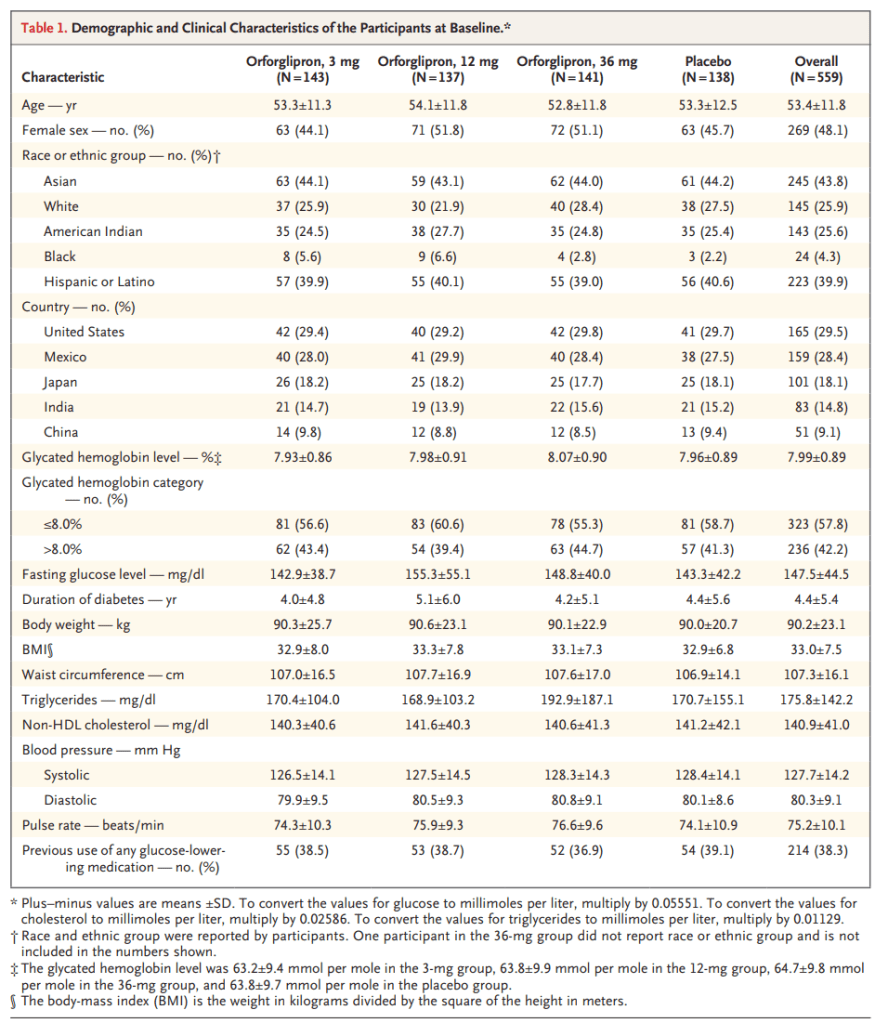 - Intervención: orforglipron en dosis de 3 mg, 12 mg o 36 mg, comparado con placebo. Se aplicó un esquema de escalada progresiva de dosis para mejorar tolerancia gastrointestinal.