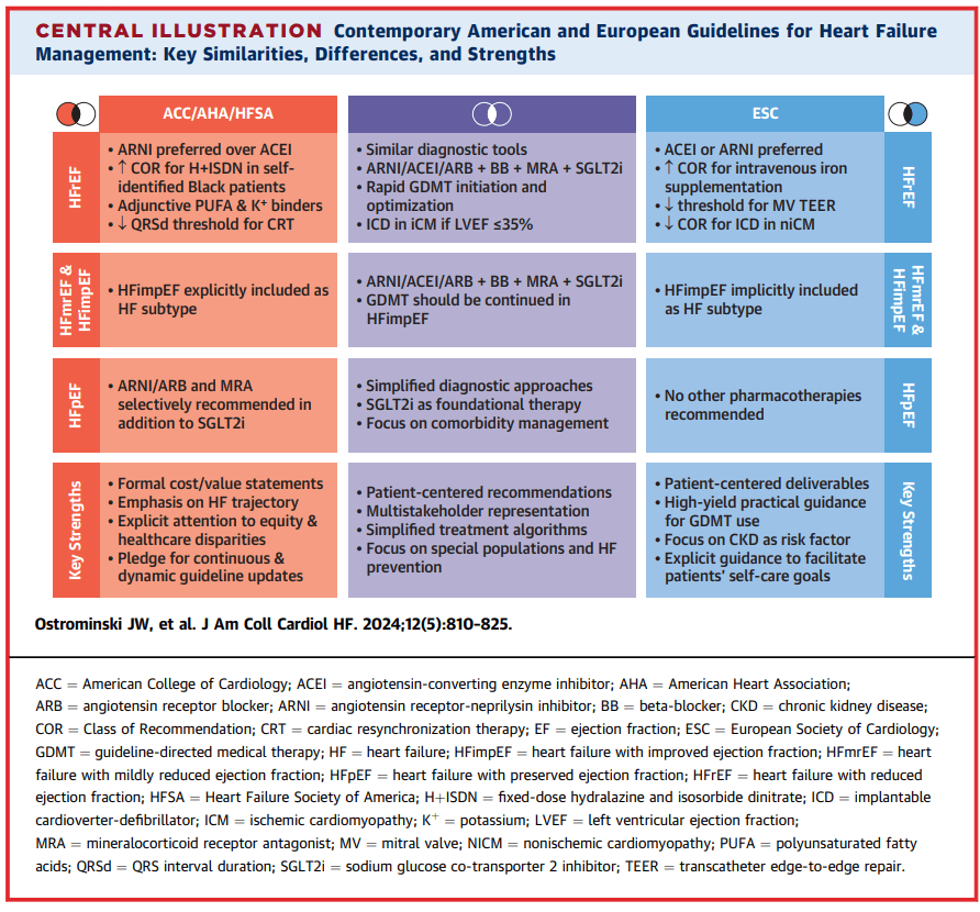 Las guías americanas y europeas muestran un grado notable de convergencia en las recomendaciones esenciales para el diagnóstico y manejo de la insuficiencia cardíaca. El énfasis común está en el inicio temprano, rápido y combinado de terapias con beneficios probados. Las diferencias reflejan realidades regulatorias, culturales y de disponibilidad de recursos, pero no modifican el núcleo de la atención basada en la evidencia.