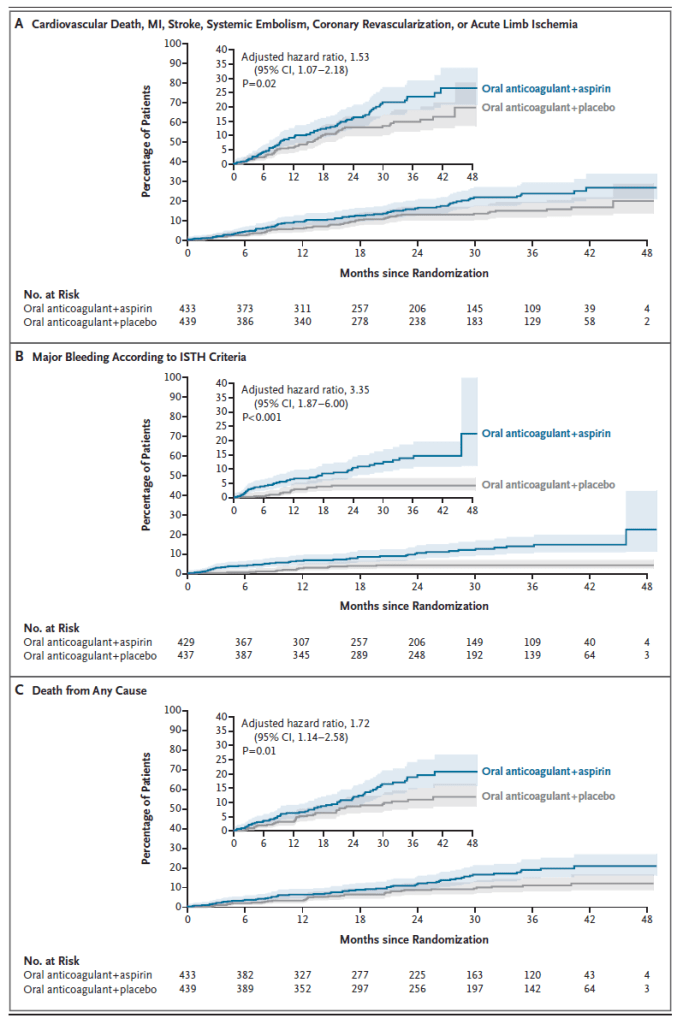 El ensayo AQUATIC demuestra que en pacientes con síndrome coronario crónico, stent previo y necesidad de anticoagulación a largo plazo, la aspirina no aporta beneficio y, por el contrario, aumenta significativamente: