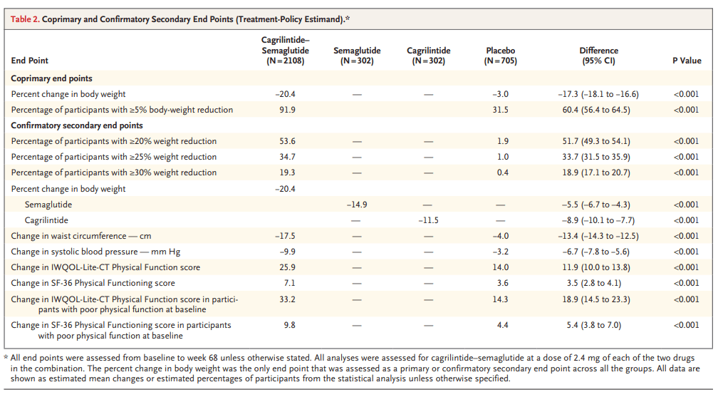| Meta | CagriSema | Placebo | Diferencia (IC 95%) |