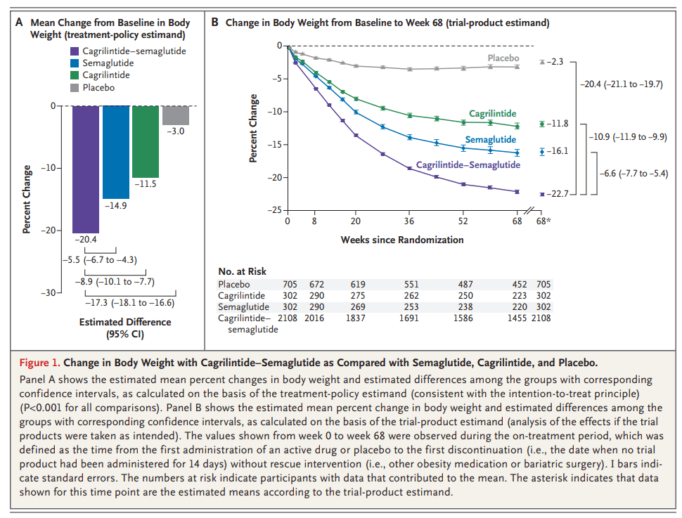 • CagriSema vs semaglutida: −5.5 pp (IC 95% −6.7 a −4.3) - Cagrilintide sola: −11.5%